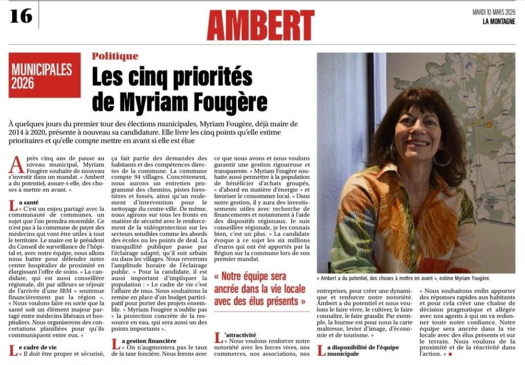 Article La Montagne Publié le 10 mars 2026   Les cinq priorités de Myriam Fougère
